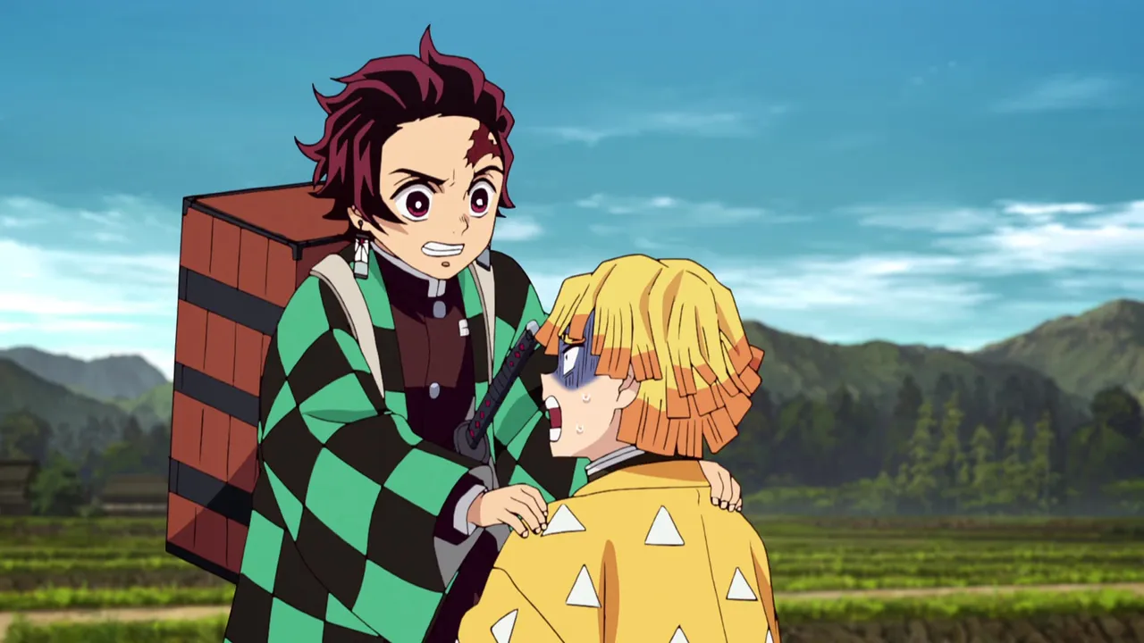 Tanjiro's next destination, according to his Kasugai Crow, is to the south-southeast. On the way, Tanjiro runs into his fellow Final Selection survivor, the swordsman Zenitsu Agatsuma. Tanjiro has a hard time dealing with Zenitsu's passive attitude as they head deep into the mountains. They encounter two children whose older brother was taken away right in front of their house. There, Zenitsu hears the sound of a tsuzumi ringing out from somewhere.