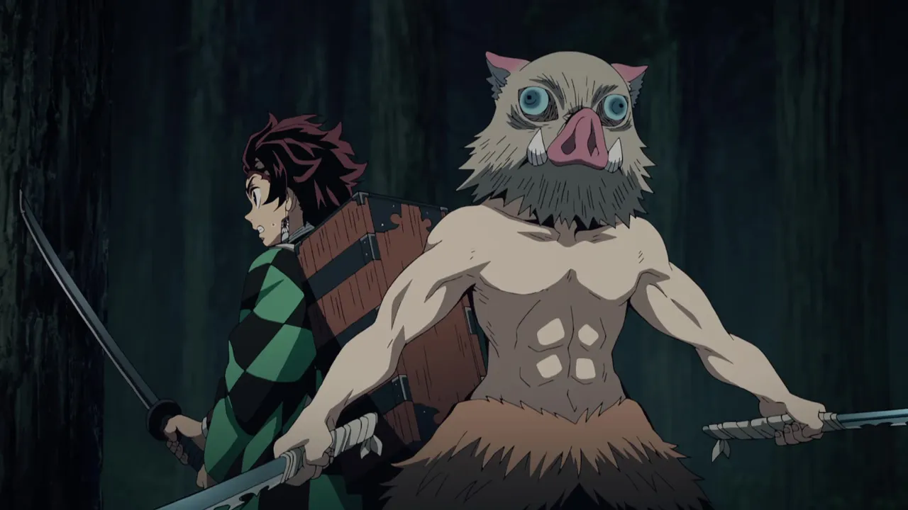 After a desperate fight to the death, Tanjiro prevails over Kyogai. He exits the house to find Zenitsu who had escaped earlier. But it is then that he sees the strange circumstances before him... The battered Zenitsu holding the box containing Nezuko in his arms while the man in the boar's head mask stands in the way with two Nichirin Swords drawn.