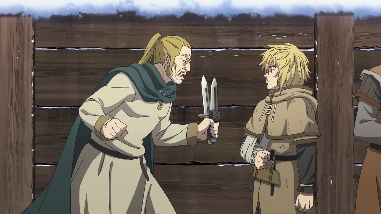 After capturing the treasure from the Franks, Askeladd’s men return to the village of Gorm on the Jutland Peninsula in Denmark to pass the winter. Thorfinn challenges Askeladd to a duel as a reward for bringing him the head of the captain of the clan of Franks. Even though Thorfinn has grown in skill through his experience in battle, he is still no match for Askeladd.