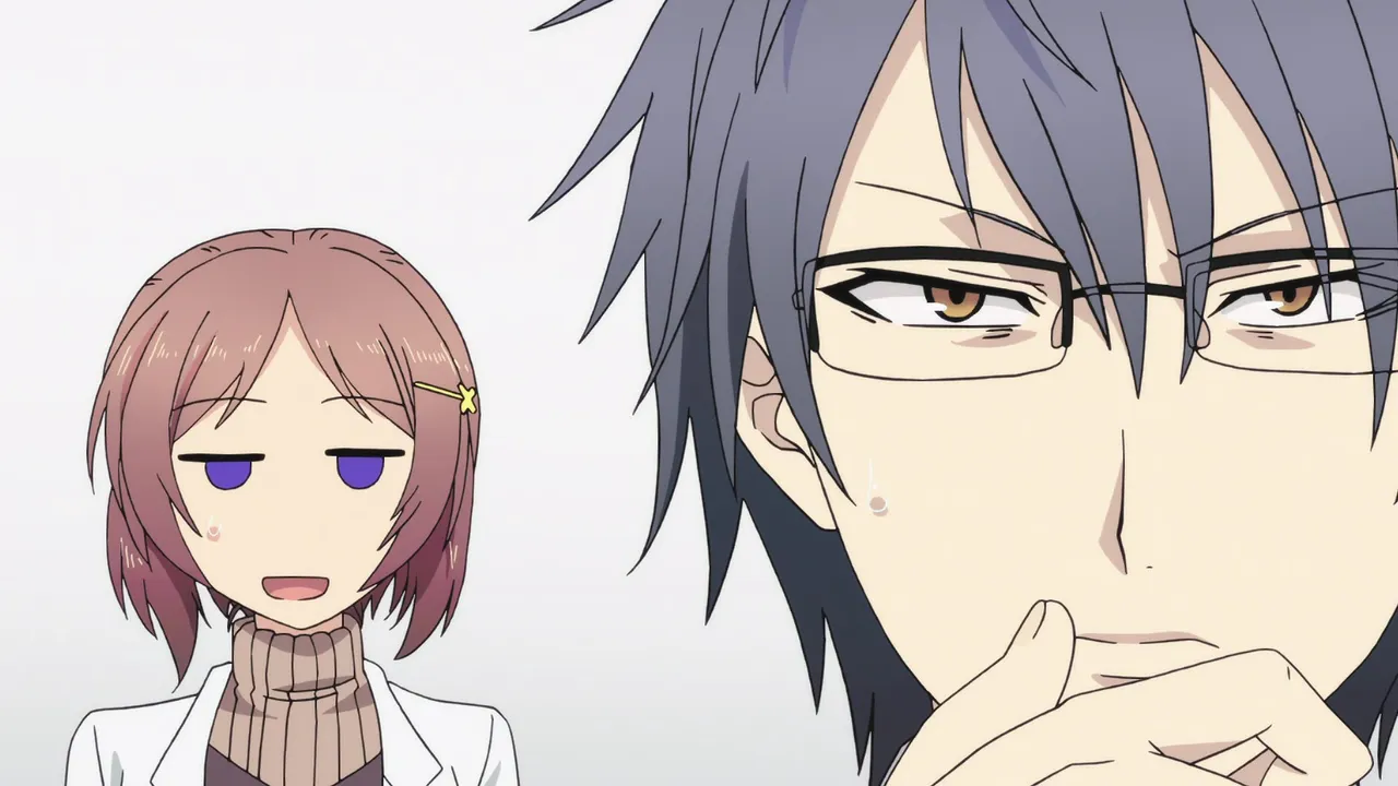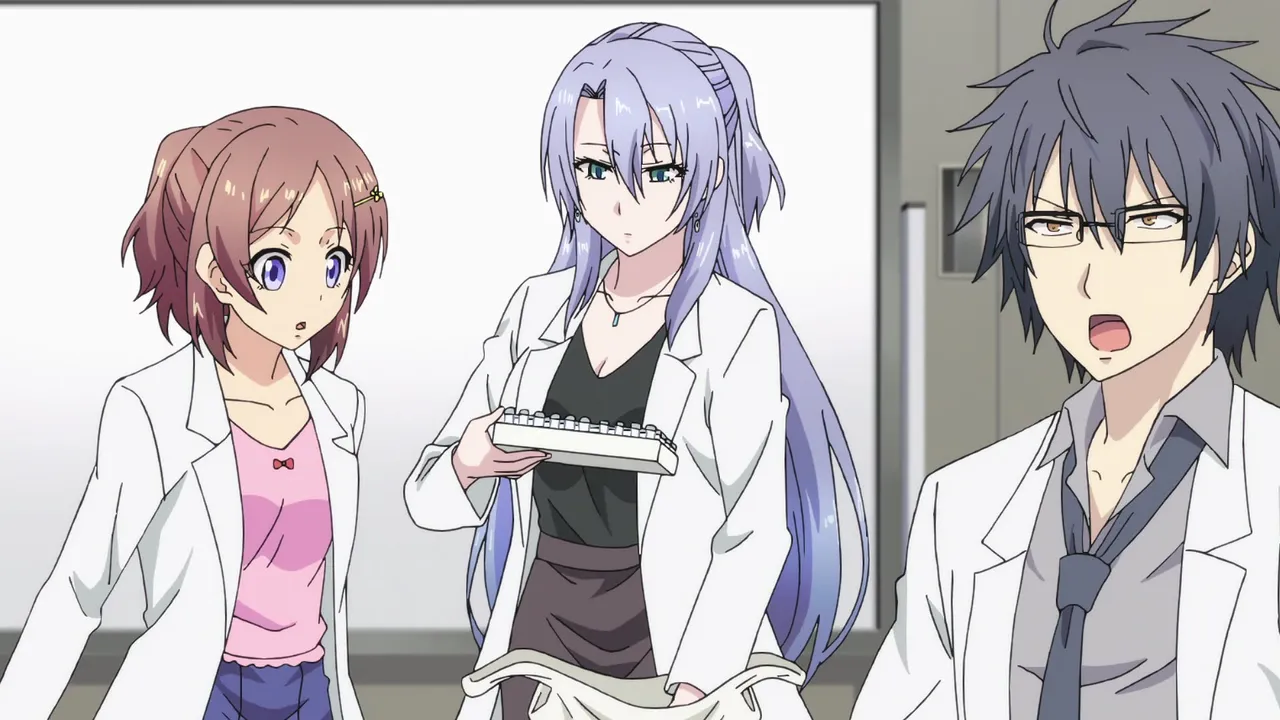 Yukimura and Himuro wear lab coats, as befits science-types, as they get ready to begin their date experiment. Kanade is there to watch over their date and record observations, but she can't help bursting in to tell them to buy date clothes. Both of them are wearing monitors for heart rate, blood pressure, and temperature, and they're using an app to record things like "times my heart raced," "times I felt happy," "times I felt relaxed," and "times I felt uneasy." Suddenly, a man appears and starts hitting on Himuro...!?