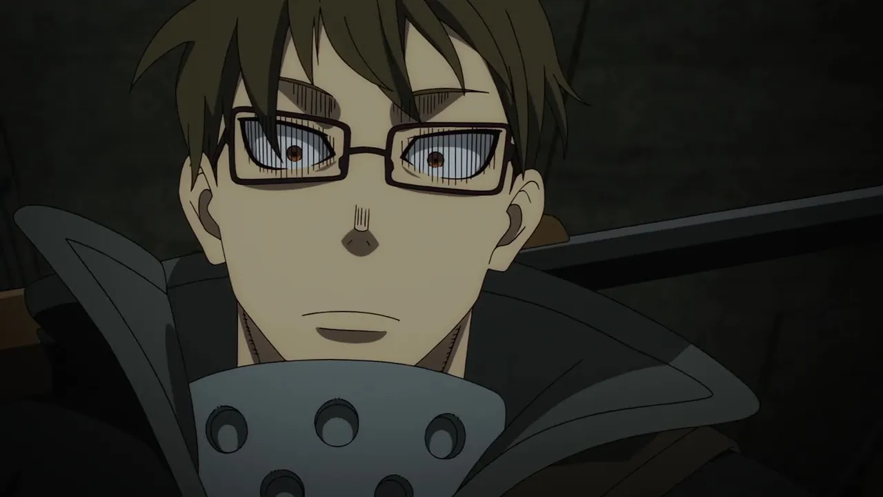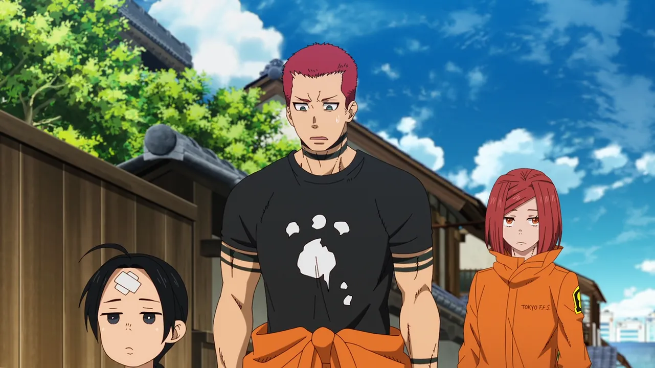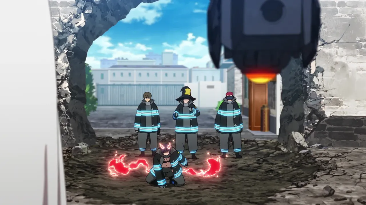As Shinra and the others take a break, an alarm sounds. Soldiers interrupt Obi's report to the Fire Chief.