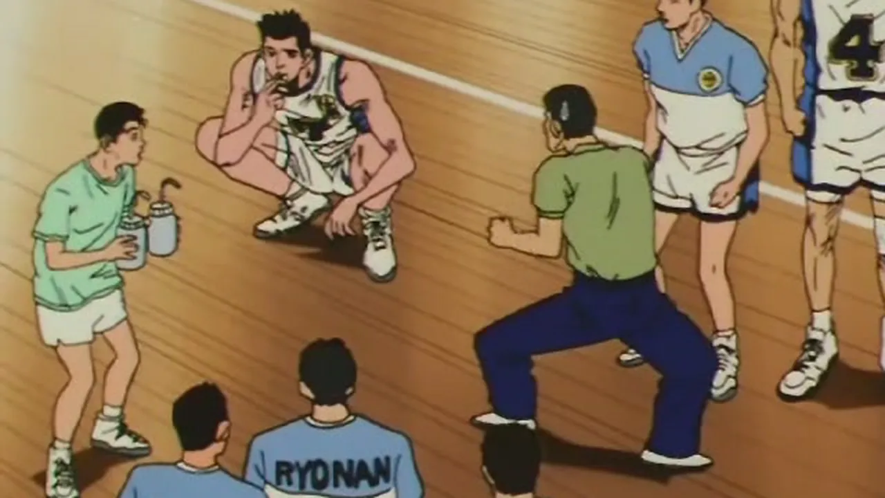 Sakuragi is eager to play too, thinking of what Akagi has told him the previuos night. At Ryonan High, Anzai is greeted by Ryonan coach, Moichi Taoka. In the locker room, Anzai finally announces the starting five players who are Akagi, Yasuda, Shiozaki, Kogure and Rukawa.
