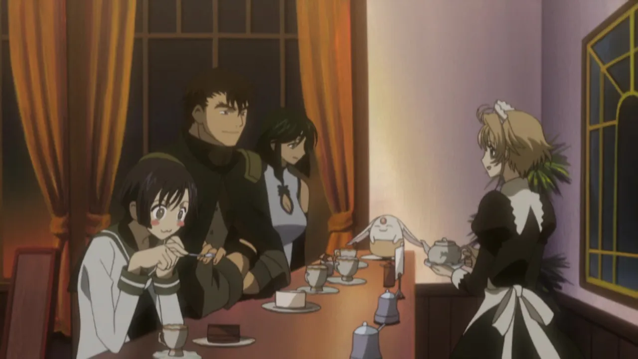 It seems Syaoran and Kurogane had stolen the prey of two demon slayer partners Yuzuriha Nekoi and Kusanagi Shiyuu as they introduce themselves Kurogane discovers from them that Fay and had given him and Syaoran the aliases Big puppy and Little puppy. Back at the cafe they treat the partners to some cake and tea while Kurogane huffs at Fay for the names (he and Sakura are Big Kitty and Little Kitty). The partners get called out for a bounty so leave promising to come back and swap stories. Syaoran and Sakura have a momentary heart to heart when Sakura almost discovers that Syaoran was probably an important person to her, but because of Yuuko's work she instantly forgets her discovery.