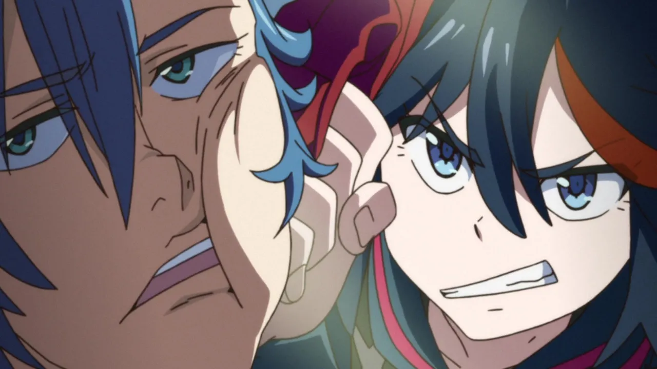 As Ryuko angrily goes into a furious attack, Nui tells her how she killed Isshin with the Scissor Blades he himself created and stealing one of its blades, but not before having her left eye slashed in the process. The boiling blood of Ryuko's rage has an adverse effect on Senketsu, causing him to go berserk and consume her, resulting in a monstrous form. As Mako and her family head towards the scene in order to save Ryuko from dying of blood loss, Tsumugu tries to draw away Nui to give Aikuro the opportunity to use an adhesive bullet on Ryuko. Satsuki dons her Kamui in order to put a stop to Ryuko, but it is Mako who manages to slap Ryuko to her senses and bring her back to her normal self, saving her life. A few days later, as Ryuko is recovering from her battle, Satsuki reveals that she was the one who ordered Nui to steal the sword scissors from Isshin, before announcing that Ryuko's battles with the Elite Four have helped her perfect the Goku Uniforms so that they can take over every school that opposes them.