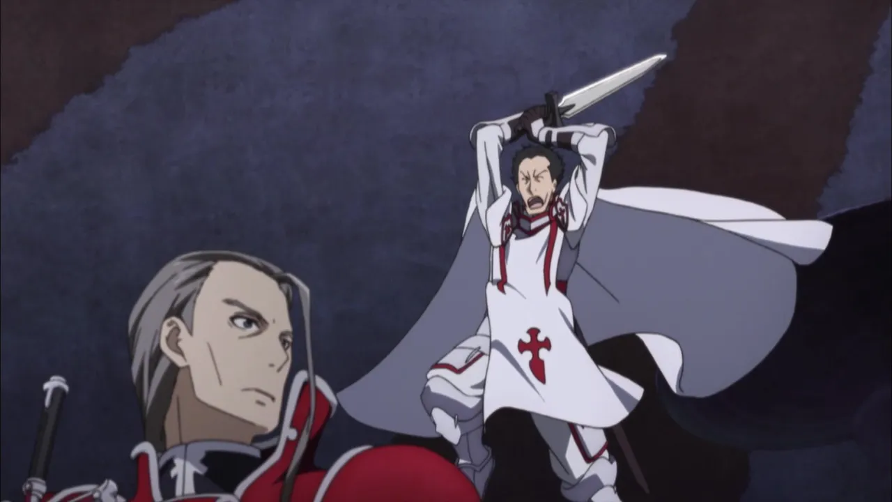 At the entrance to Thrymheim, Yui explains that the quest they were given was created by the Cardinal System's Automatic Quest Generation Function and that if they did not succeed in their quest, a final war event, Ragnarok, would be triggered. Sometime later, at the end of the second floor of Thrymheimr, the group encounters two minotaurs, and they are forced to rely on Sword Skills that could deal elemental damage to them in addition to physical damage, but also leave the player rigid for a few seconds after the skill is used up. With Kirito revealing his new technique of using consecutive Sword Skills with each of his swords to avoid the period of rigidity, they are able to defeat the two minotaurs. Later, after defeating the boss guarding the entrance to the lowest floor of the castle, they encounter an NPC woman trapped in an ice cage along the way. Although the others insist that it is a trap and plan to avoid her, Klein ignores their advice and frees the woman, who was revealed to be Freyja. Instead of running away, Freyja asks to join the group and Kirito reluctantly agrees to the request. After preparing for the final battle by recharging their buffs, the group enters the throne room, where they met the king of the frost giants, Thrym.