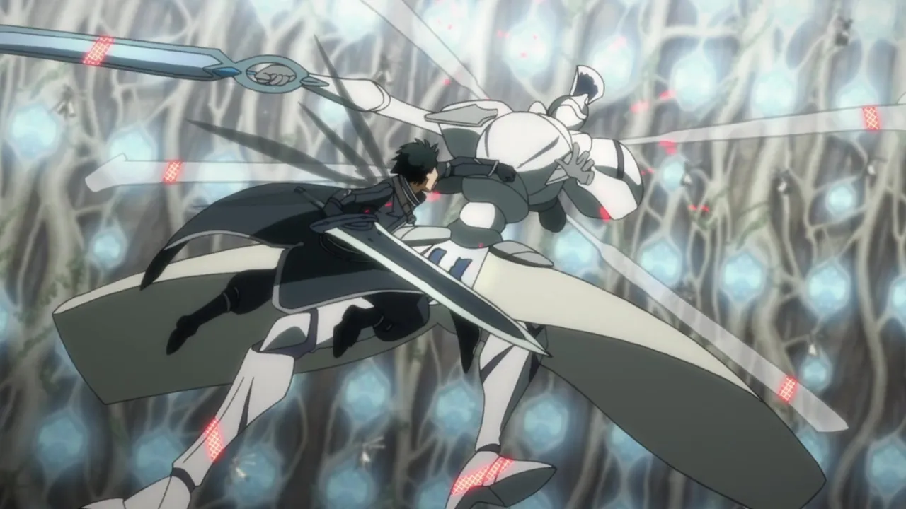After Kirito blocked the raiding guild's reinforcements, three mages of guild fired multiple magical projectiles at him. However, he used «Deadly Sins» to break all seven projectiles. As the reinforcements got into formation for battle, Kirito told Asuna that he would hold them off for three minutes with the help of Klein. In the meantime, the Sleeping Knights engaged the guild's forces blocking the path to the boss room. But, seeing that their assault was rendered useless by the intervention of the guild's healers, Asuna asked Siune to manage the healing herself and used «Flashing Penetrator» to break through to the healers, while killing the group's leader. After the healers were disposed of, the remained of the players were easily defeated, allowing Asuna and the others to enter the boss room. During the boss battle, Talken's spear was thrown into the air by the boss and it accidentally hit a crystal where the boss's two heads connected. Seeing that this caused the boss to assume a guard stance, Asuna deduced that it might be its weak point and tested it out by firing several ice pillars at the same spot. Confirming her deduction, Asuna left the healing to Siune to tell Yuuki to use a Sword Skill at the weak spot. Following Asuna's suggestion to use Tecchi as a stepping stone, Yuuki defeated the boss with her signature Original Sword Skill. After the battle, the group agreed to celebrate at Asuna's player home. While conversing about various things, Asuna asked whether she could join the Sleeping Knights, but, seeing that it resulted in an unpleasant reaction, she decided to change the topic and reminded everyone about the Monument of Swordsmen. At the monument, everyone took a picture and Yuuki accidentally called Asuna as her elder sister. Since she had also done the same in the boss room, Asuna pointed this out to Yuuki. Unexpectedly, Yuuki started crying and abruptly logged off.