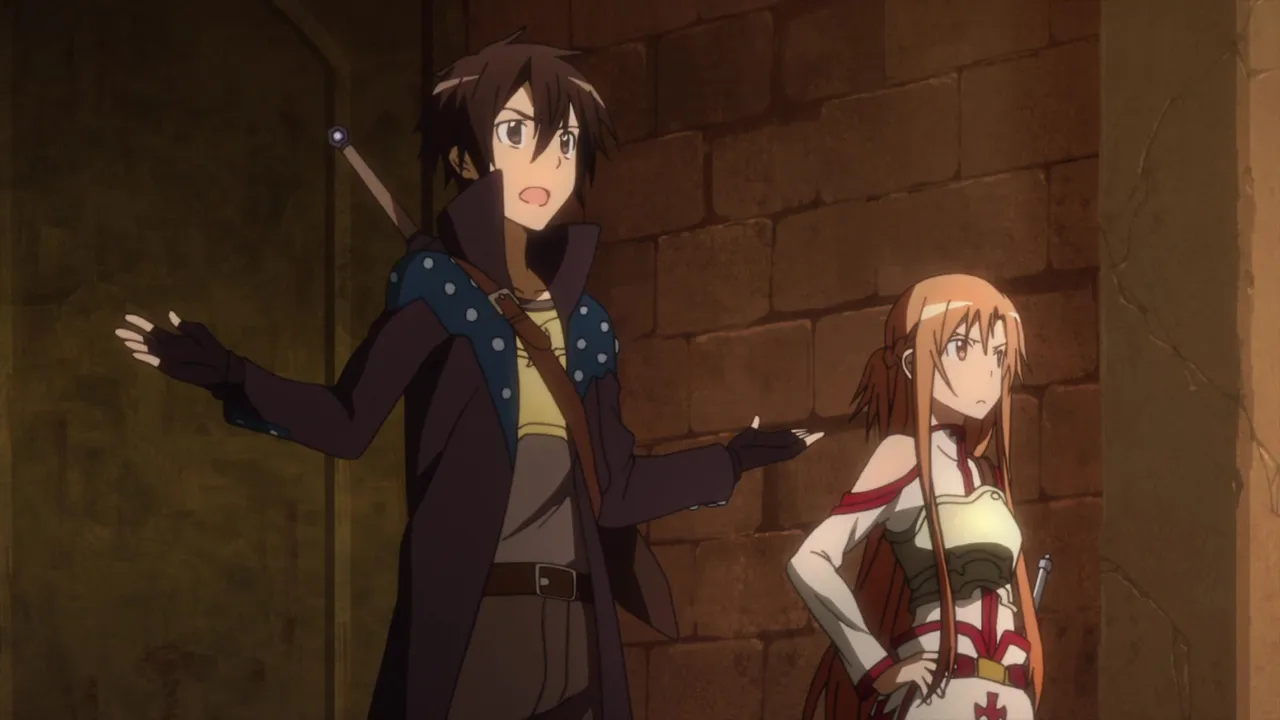 Yuuki takes Asuna to an inn in Ronbaru and introduces her to the other members of the Sleeping Knights: Jun, Nori, Siune, Talken and Tecchi. Yuuki then reveals that the guild wanted Asuna's help in defeating the next Floor Boss with just one party. Siune explains that the group wanted to defeat the boss in order to etch their names on the Monument of Swordsmen, as they would not be able to adventure together after winter. After some thinking, Asuna agrees to help. Sometime later, while she is walking to the Teleport Gate plaza, Asuna is suddenly disconnected from the game by an unsatisfied Kyouko. After an unpleasant conversation with her mother, Asuna heads to a park in another residential area. There, she considers calling Kazuto, but decides that she did not want to expose her weakness to him. The next day, she meets up with the Sleeping Knights and they easily manage to reach the boss room, but Asuna detects several other players hiding near there. Though the players claim they are waiting for their friends, Asuna realizes they were actually spying on their battle to study the boss without sacrificing their own men. After the Sleeping Knights and Asuna are defeated and re-spawn in Ronbaru, Asuna tells the others what she discovered and they decide to rush to the boss room again before the guild had enough time to gather a raid group. At the boss room, they find a large amount of players gathered at the door. As the guild rejects the request of the Sleeping Knights to let them try again, Yuuki declares that they would fight it out and attacks the raid group's leader. At that point, the rest of the raid party arrives, but Kirito appears, having followed them, and blocks their path.