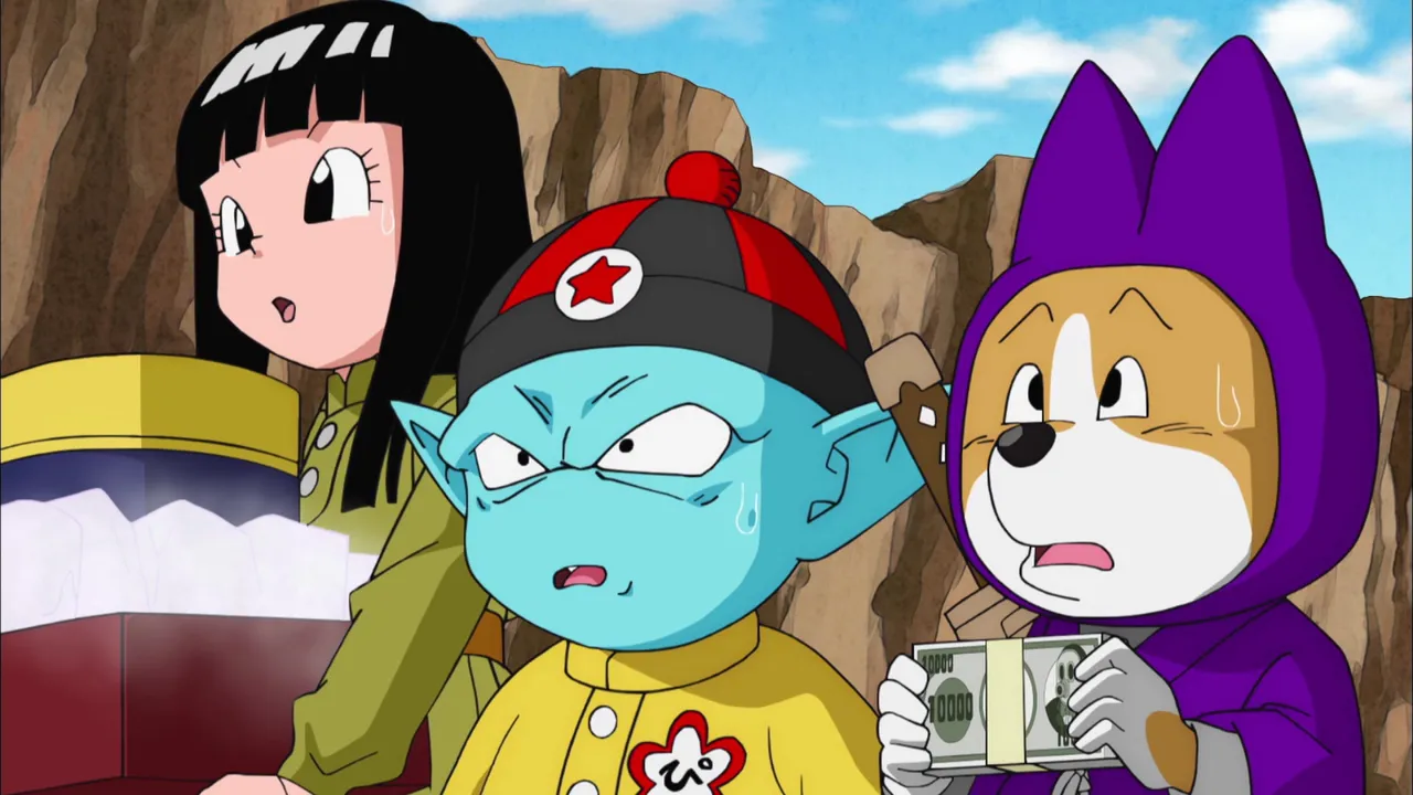 With Earth no longer in danger, Gokuu and the others return to their ordinary lives. Chichi orders Gokuu to leave training behind and find a job so he can support the family. Meanwhile, Mr. Satan`s self-promotion goes awry when a group of aliens land in the city. The aliens reveal that they are ambassadors who wish to thank and reward whoever defeated Beerus; thus protecting their planet from destruction. Before he is given the reward, however, Mr. Satan is asked to demonstrate his godlike power against the alien`s mightiest champion in a sparring match. Knowing that he does not stand a chance, Mr. Satan quickly scampers away to safety and calls for help, but no one answers him. Suddenly, Gokuu arrives at the scene in need of Mr. Satan`s help. Mr. Satan arranges to have Gokuu fight in his stead. Just before the fight, however, Gokuu spots Chichi and immediately runs away to avoid being scolded for disobeying her. Mr. Satan is left to confront the alien champion on his own. Suddenly, the aliens spot Mr. Satan`s dog and run away in fear. With the aliens gone, the crowd praises Mr. Satan, whom they think saved them and Earth yet again. Source: Wikipedia