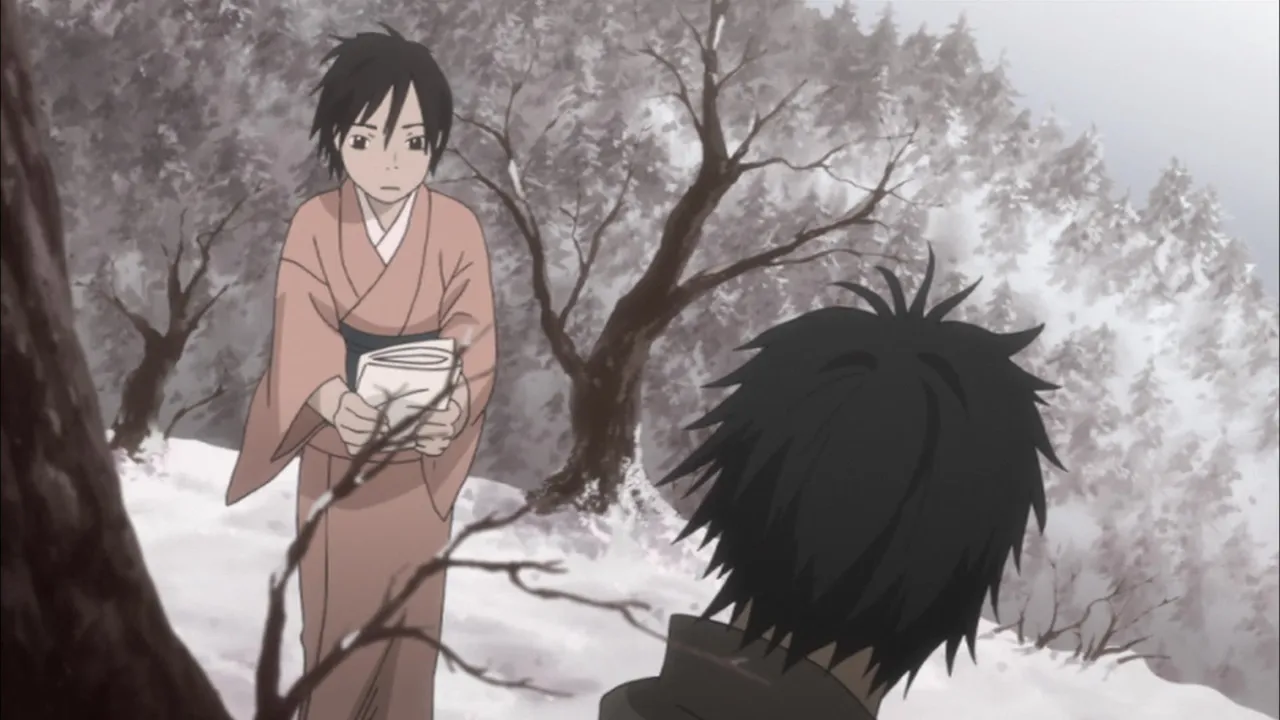 "When all are sheltering within, there comes an imitation of spring. Linger in bliss for too long and your flesh will soon be frozen..." Caught in a blizzard, Ginko is decides to look for shelter and finds a home where the owner, Suzu allows him to stay the night. The next day Ginko sees a boy, Miharu who seems to be fascinated by Mushi. Ginko learns that Miharu once disappeared into the mountains in the winter and then suddenly came back in spring, able to see Mushi. Miharu has been repeating this since and it may be caused by a "Harumagari" so in the end, Ginko decides to teach him more about Mushi.