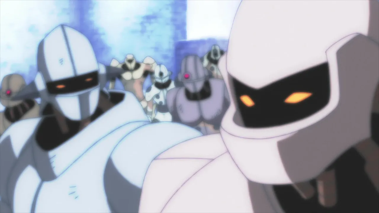 Rather than focusing on Casshern, this episode follows Dio and his quest to reestablish his utopia by gathering wandering robots to form his army. During the gathering, a mysterious robot dressed heavily in tattered cloak barges in rambling about the death of Luna. It is revealed the robot’s name is Dune, a guardian assigned as Luna’s bodyguard. Leda attempts to dispose of Dune but in the end requires Dio’s help. It was in a fit of rage for being mistaken as Casshern, Dio viciously incapacitates Dune. As Dio with Leda by his side raises the spirits of the wandering robot with his speech, a broken down Dune once again wanders the lands morning the death of Luna.