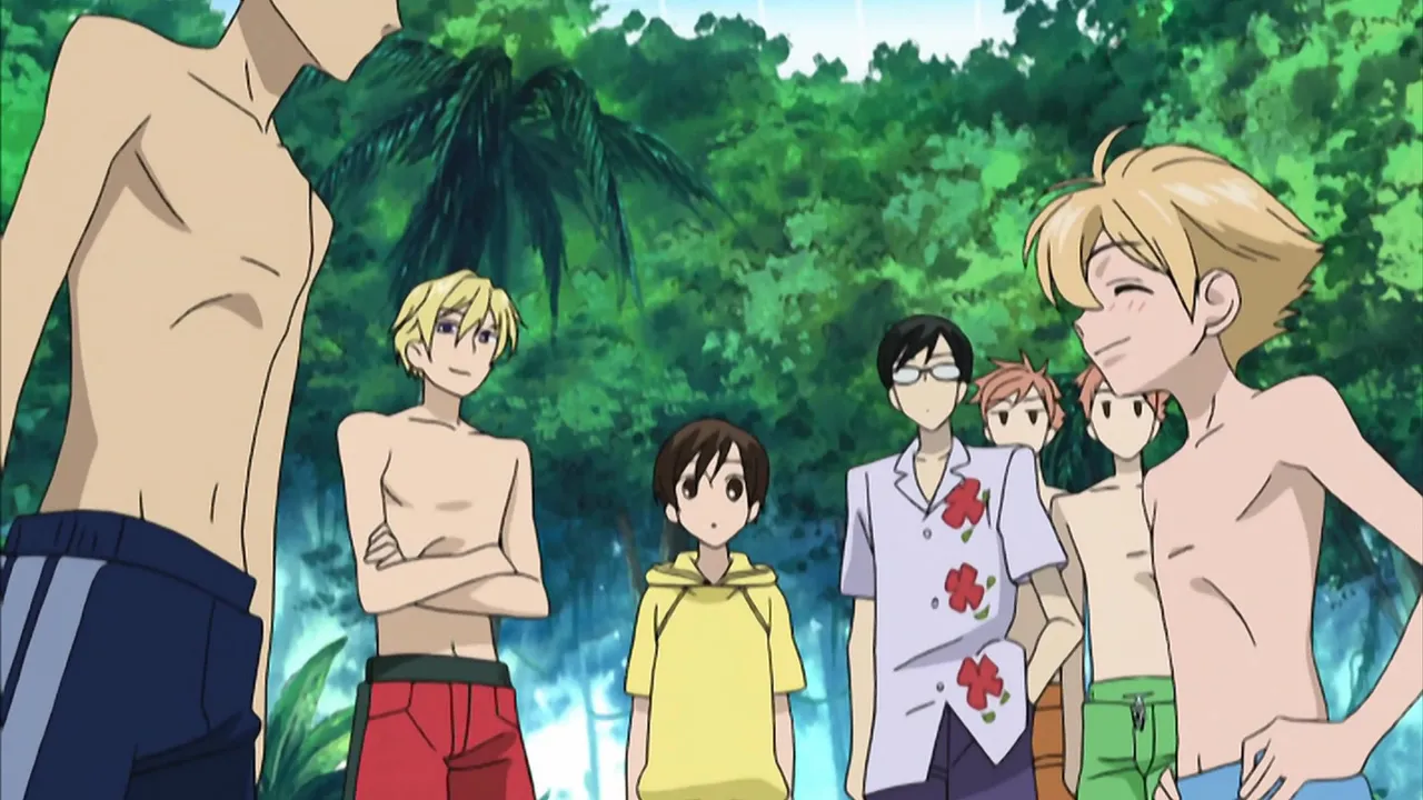 The Host Club drags Haruhi to an artificial tropical beach, but an accident separates Honey from the rest of the gang. Mori and Haruhi separate from the rest of the group to look for him, Mori eventually carrying her due to her slowness and clumsiness. Haruhi wonders aloud about Mori's and Honey's relationship, and then twins explain that they are in fact cousins by marriage. Meanwhile, Kyouya's guards, called in to look for Honey, end up mistaking Haruhi as the "small boy" Kyouya had described, and, under his orders, attempt to arrest any "suspicious people", as they believe that Mori looks suitably suspicious. Honey swings in on a vine, amazing Haruhi with his martial arts ability. The gang returns, ending the episode with Haruhi noting, much to the surprise of the twins and Tamaki, that she would enjoy visiting a real beach.