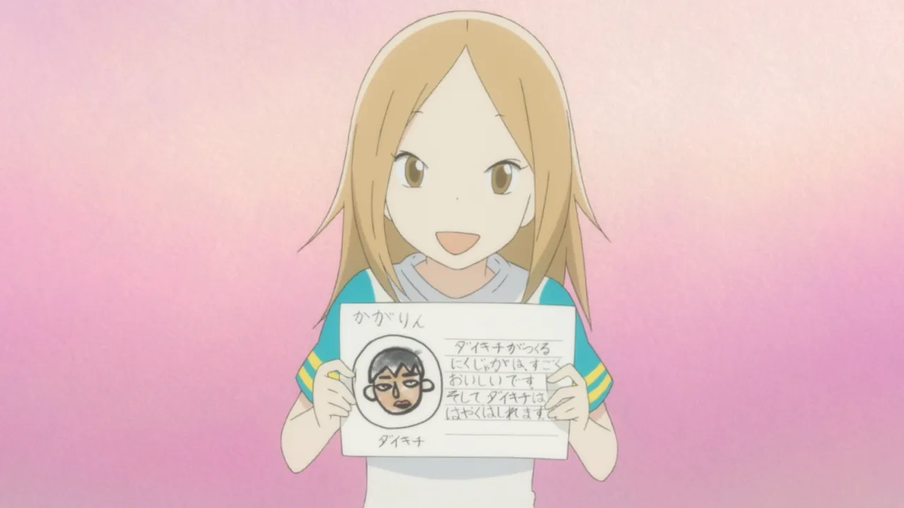 As Daikichi wonders how to juggle his worklife around taking care of Rin, he takes her to his parents house. As Daikichi looks through Souichi's house for clues on Rin's mother, he finds an out-of-place modem. When he asks Rin about it, she talks about a maid named Masako, who was listed in Rin's health booklet. As Rin wets the bed again last night, Daikichi understands her fear of death and reassures her. The next day, Daikichi requests a transfer at his job to better fit his time around Rin.