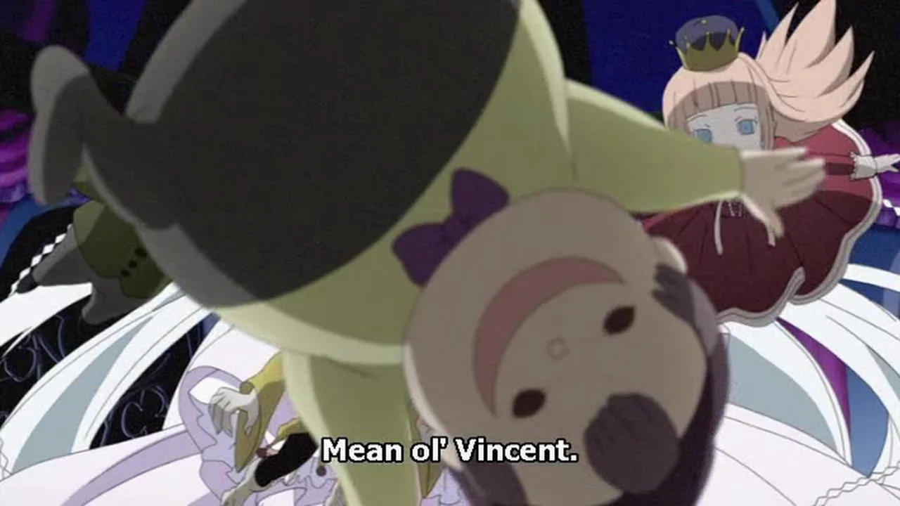 Why would Vincent kill Alice's cat Cheshire and then kill her? As Break, also known as Keven Regnard, wakes from his feinting spell, he tells Rufus Barma, Oz and co. all he knows. In the Will of the Abyss's room, Vincent shows up along with Gilbert in his arms. After Vincent collapses, Will of the Abyss starts yelling at him about how he should be dead then she starts to cry. She looks at Break and asks who he is then screams that it's teatime. She says she can't wait for her playdate with Jack and Vince tells her that he's dead. He blames Sabrie, Jack's death and he and Gil ending up in the Abyss on her. She has a breakdown and her whole room/dimension starts falling apart. Vince welcomes it with laughter, saying he'd be normal if everything broke. At the last minute, Break promises her anything if she'll just make it so his past was changed. She hears his cry and grants his wish. Suddenly, the scene flashes to Jack's memory, saying that Alice would switch her tastes constantlly as if she were a different person. She says that her twin sister is the Will of the Abyss. After obtaining this information, Lord Barma wants to take Alice and Break into custody, but Oz won't let him. The group goes back to the mansion and on the way, Break tells the rest of his past. The family he served lived for a time, but later was killed. He says he hates the Will of the Abyss on false terms because she granted his wish.