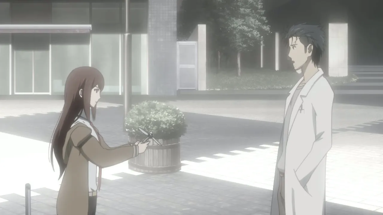 Makise pays an unexpected visit to the lab, much to Okabe's dismay; however, her intrusion leads to further experimentation with the phone microwave, a device Okabe now believes to be a time machine.